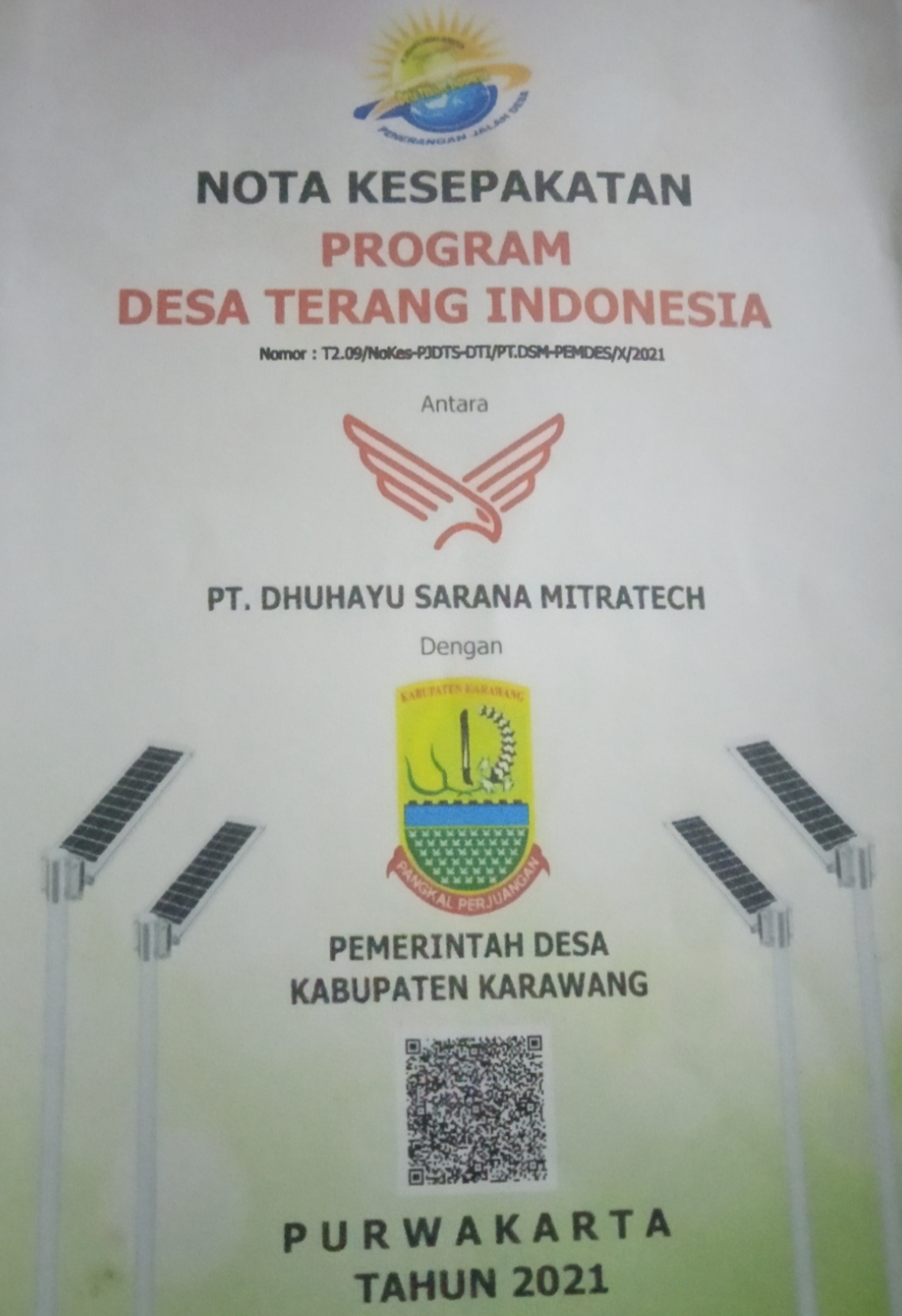 Karawang, (HK) – Minggu 24 Oktober 2021. Para kepala desa se Kabupaten Karawang dengan PT.Dhuhayu melakukan Perjanjian Kerjasama (MoU) tentang pemasangan lampu Penerangan Jalan Desa Tenaga Surya (PJD TS) program desa terang Indonesia.