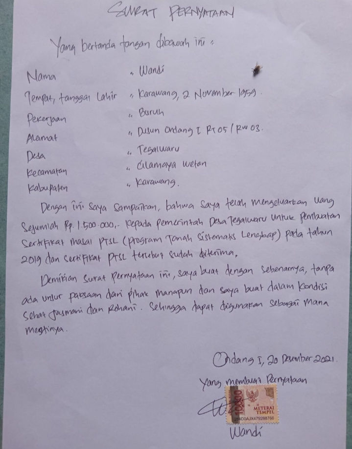 “Saya diminta 1,5 juta untuk biaya sertifikat PTSL. Dan saya sudah membuat surat keterangan tenang biaya PTSL tersebut, ditandatangani oleh saya diatas materai, jadi bukan rekayasa dan tidak bohong,” ungkap Wandi menjelaskan kepada media ini, Jumat 20 Januari 2022 dirumahnya.