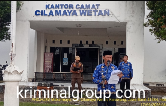 KARAWANG II Camat Kecamatan Cilamaya Wetan Kabupaten Karawang Basuki Rachmat menyampaikan makna tentang Hari Kesadaran Nasional bagi seluruh Aparatur Sipil Negara (ASN) lingkup Pemerintah Kecamatan Cilamaya Wetan yang diperingati pada tanggal 17 Pebruari 2023 saat Apel Pagi, Jumat (17/2/2023) di Halaman kantor Camat Cilamaya Wetan.