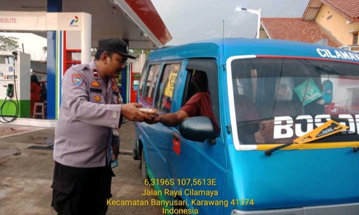 Personil Polsek Banyusari Aiptu Juanda, Aipda H.Sarin, Aipda Rahman, Briptu Yudha Ngabuburit berbagi takjil kepada setiap pengendara dan masyarakat yang melewati depan SPBU Cicinde – Banyusari, Rabu sore (12/4/2023).