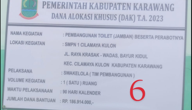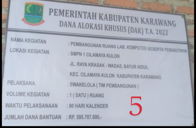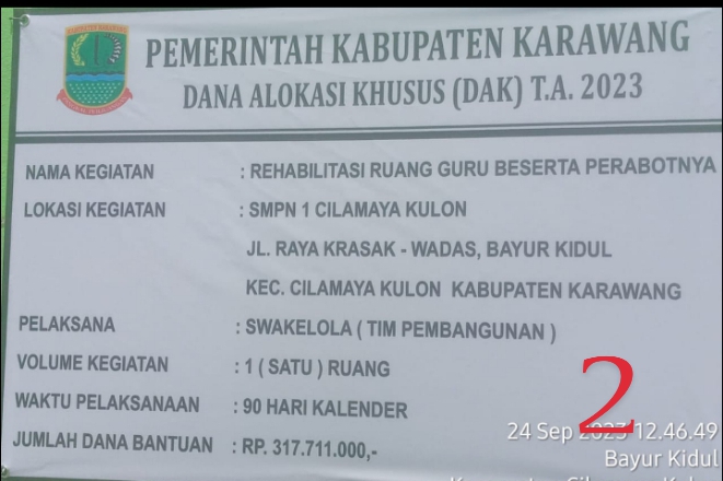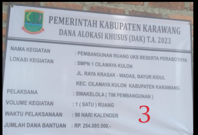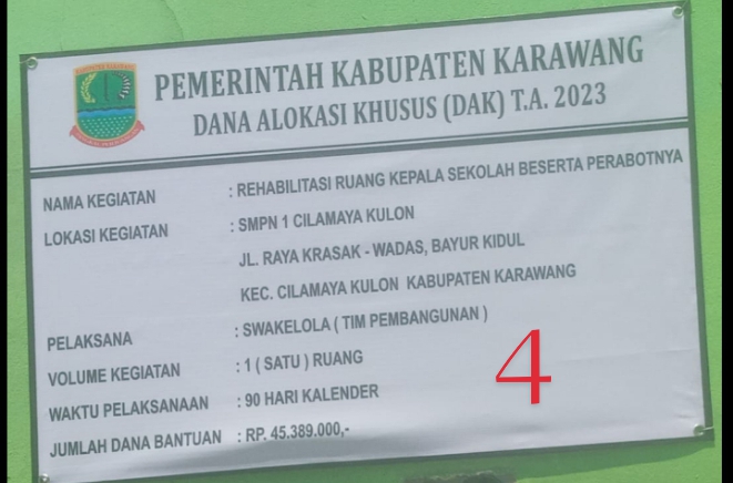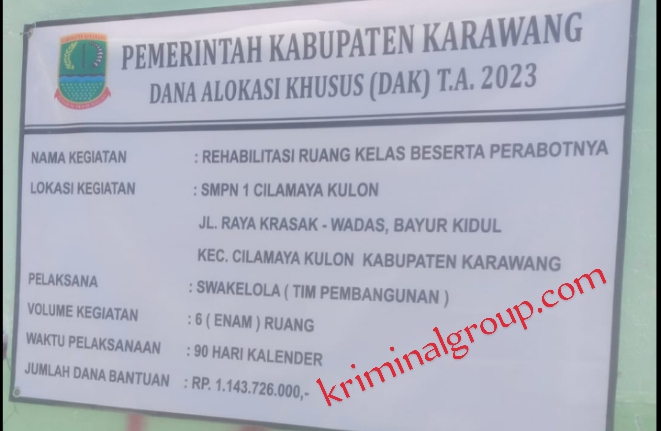 KARAWANG II Proyek Rehabilitasi Gedung SMPN 1 Cilamaya Kulon yang beralamat di Desa Bayur Kidul Kecamatan Cilamaya Kulon Kabupaten Karawang tepatnya depan kantor desa setempat dibawah pimpinan Kepala Sekolah H.Ubaidillah yang juga menjabat sebagai Plt.kepala SMPN 1 Cilamaya Wetan dimana sebentar lagi akan memasuki masa Pensiun dipertengahan tahun 2024, bantuan tersebut bersumber dari Dana Alokasi Khusus (DAK) tahun anggaran 2023 dan dikerjakan secara Swakelola (Tim Pembangunan) atau alias tidak dipihak ketigakan/diborongkan.