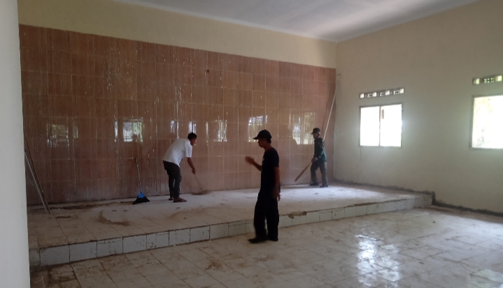 Pembuatan aula kantor desa ini telah selesai dilakukan dan menyisakan bahan material kayu, sehingga aparatur desa bergotong royong bersama sama mengumpulkan kayu supaya bisa digunakan.