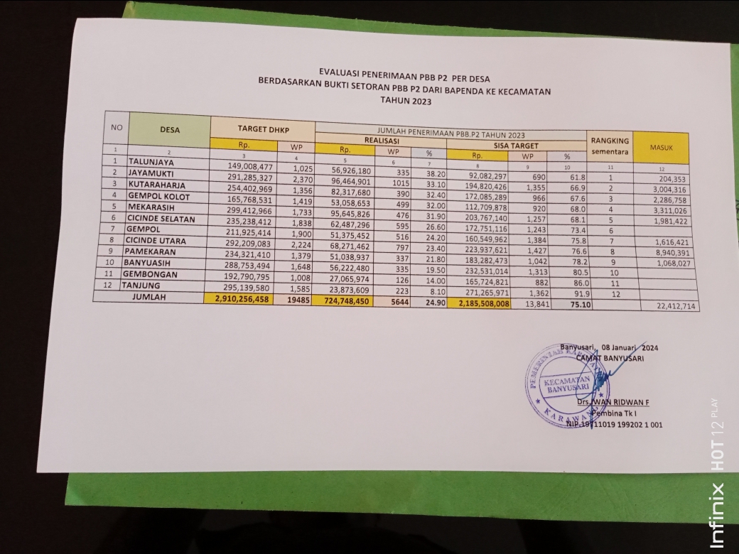 Menurut Heri, perolehan PBB tertinggi tahun 2023 dicapai oleh Desa Talunjaya sebesar Rp 56.926.180,- disusul Desa Jayamukti Rp 96.464.901,- dan Desa Kutaraharja sebesar Rp 82.317.680,-.