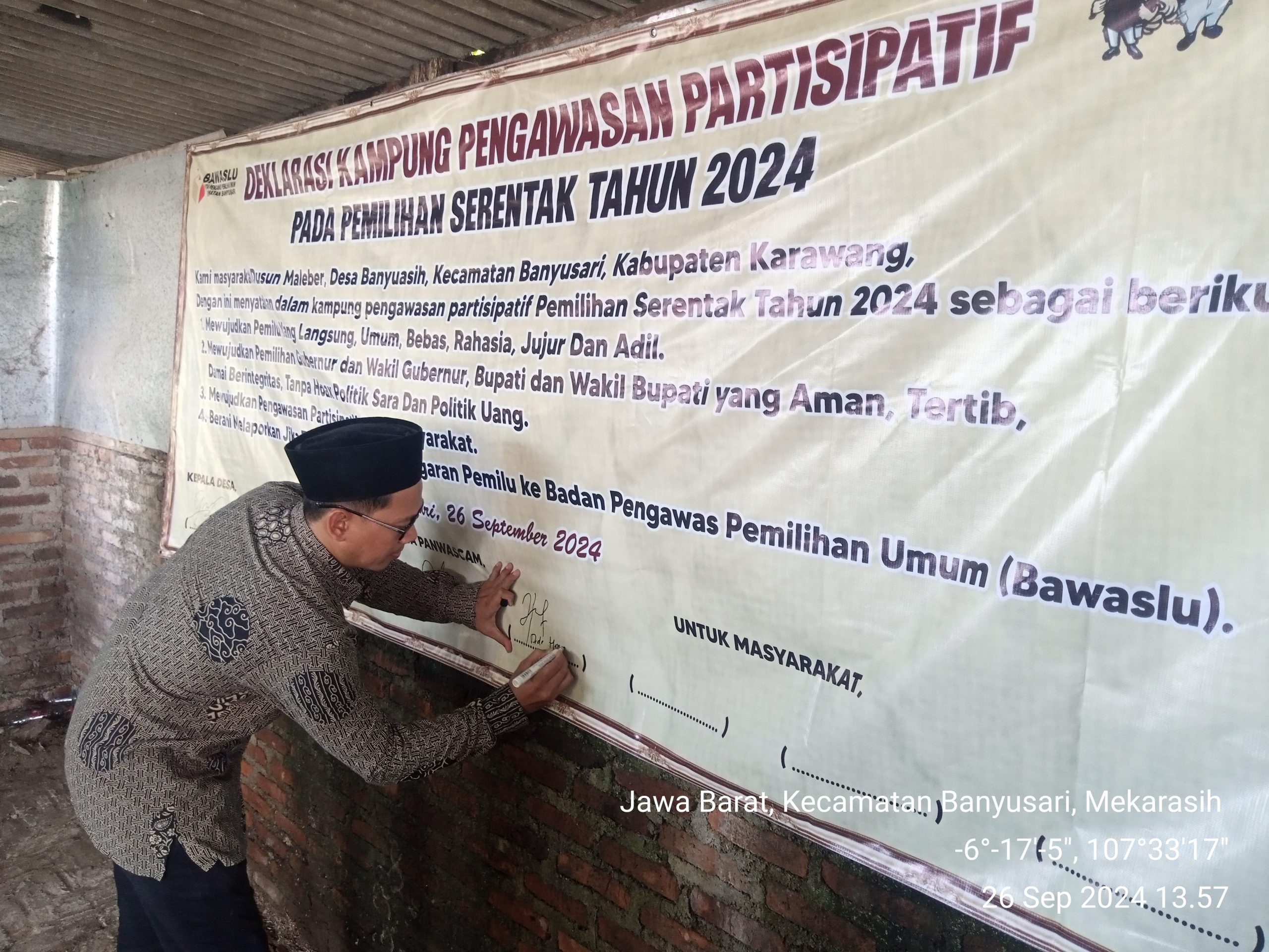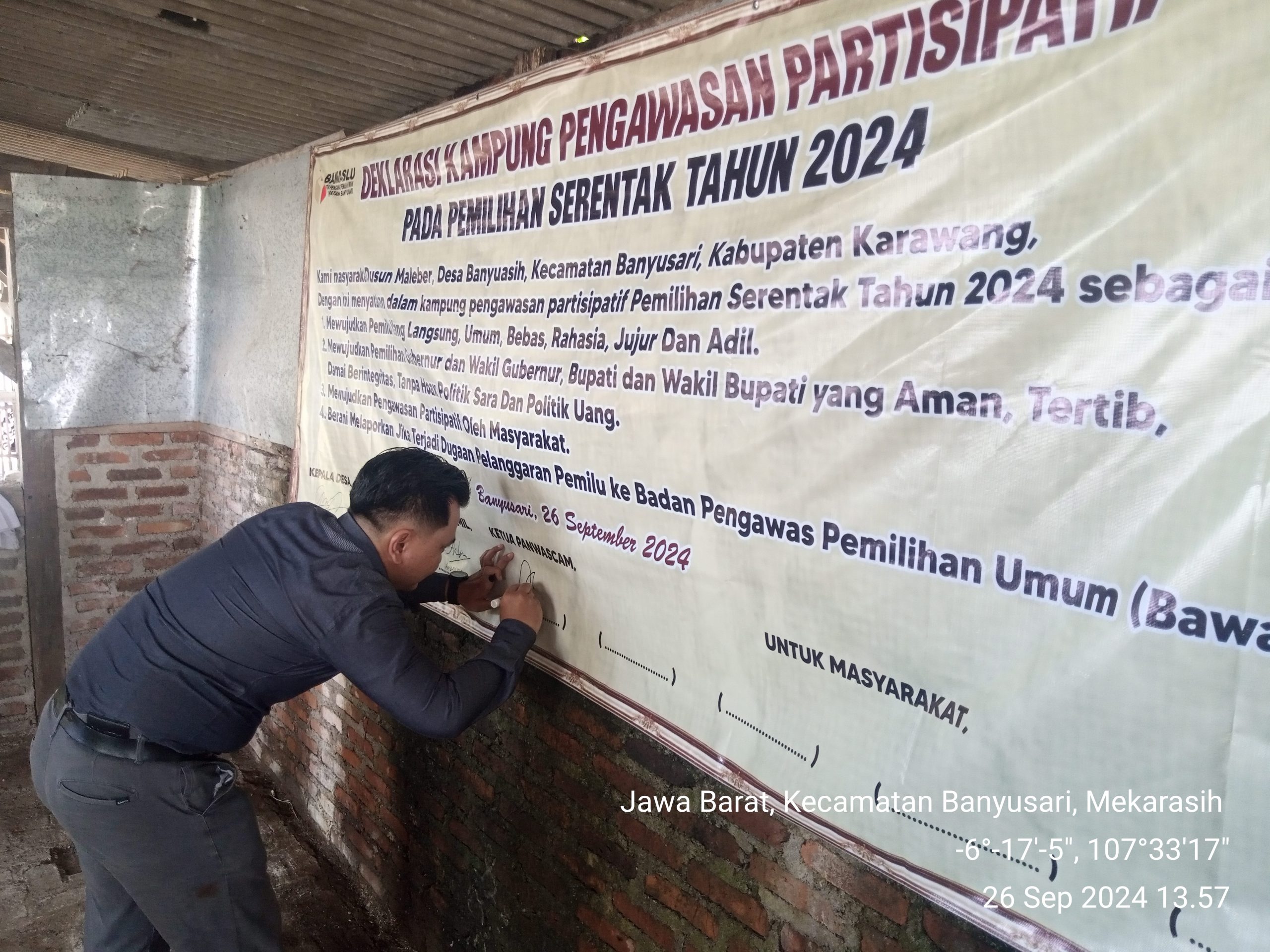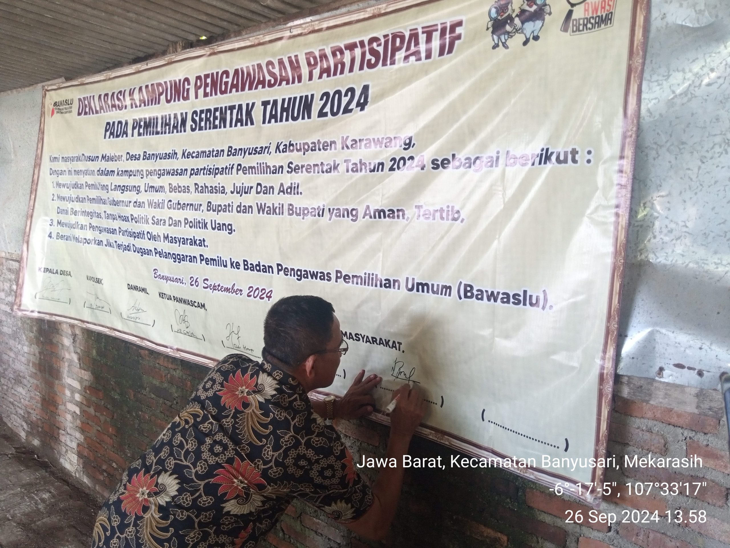 KARAWANG | Panwascam Kecamatan Banyusari Kabupaten Karawang laksanakan kegiatan Deklarasi Kampung Pengawasan Partisipatif pada Pilkada serentak 2024 yang dilaksanakan dihalaman rumah mantan Kades Banyuasih H.Mahpudin Dusun Maleber Satu Desa Banyuasih pada Kamis 26 September 2024.