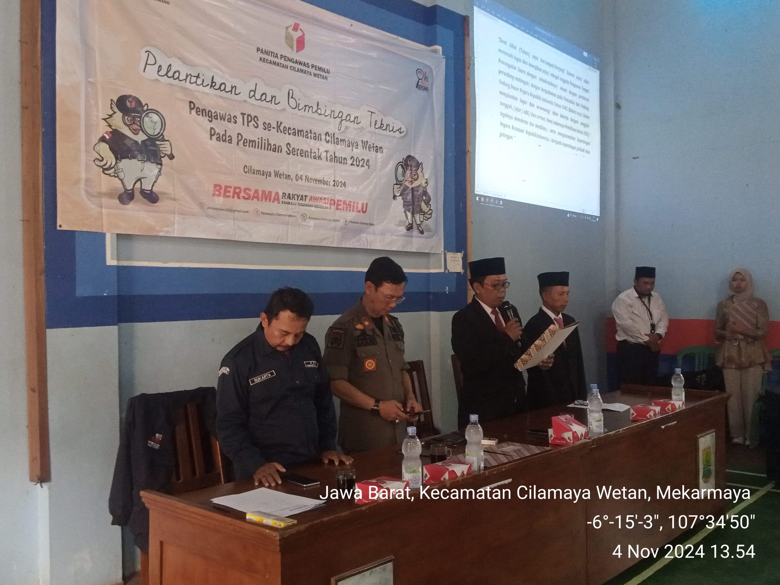 Acara dihadiri Plt.Camat Cilamaya Wetan Basuki Rachmat, ketua PPK Cilamaya Wetan Sukarta, komisioner Panwascam Cilamaya Wetan, para PKD serta para petugas PTPS selaku peserta pelantikan.