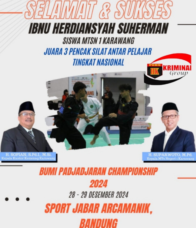 KARAWANG || Siswa MTsN 1 Karawang kembali mengharumkan nama madrasah. Ibnu Herdiansyah Suherman siswa madrasah tersebut meraih Juara 3 Pencak Silat antar pelajar tingkat nasional yang dilaksanakan di Bumi Padjadjaran Championship Sport Jabar Ancamanik Bandung pada tanggal 28-29 Desember 2024 kemarin.