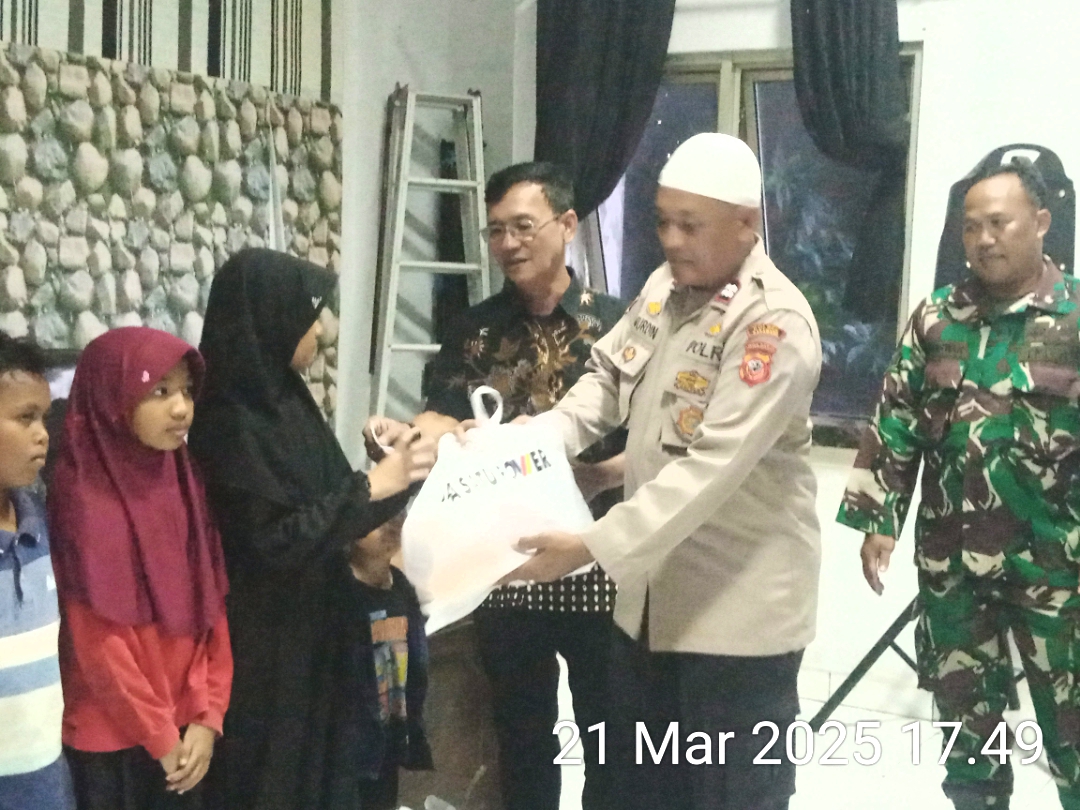 KARAWANG || Plt. Camat Cilamaya Wetan Kabupaten Karawang Basuki Rachmat menyerahkan 50 paket sembako dan nasi kotak untuk berbuka puasa kepada anak yatim yang ada diwilayahnya, Jumat aore 21 Maret 2025.