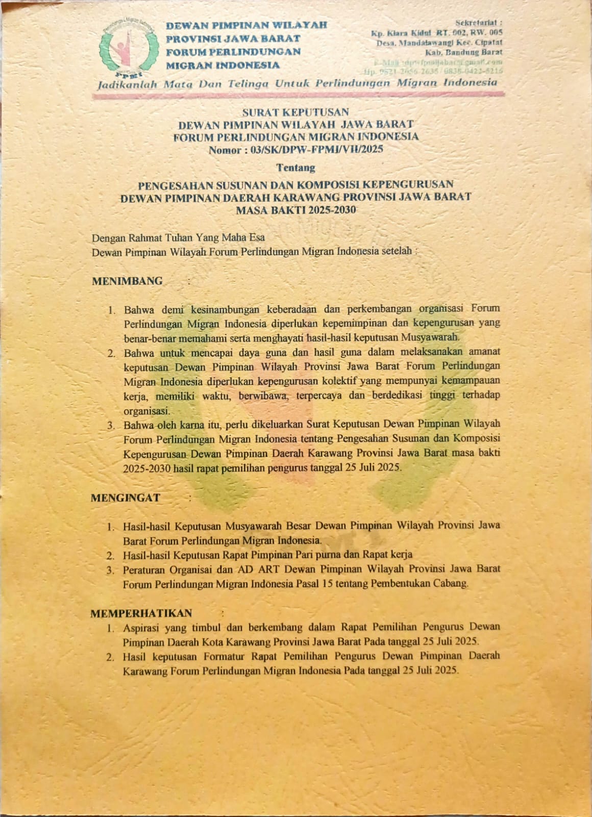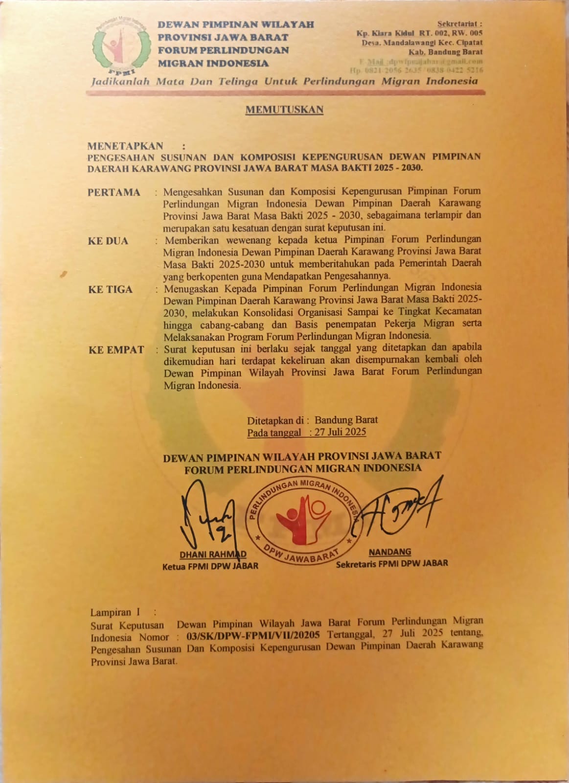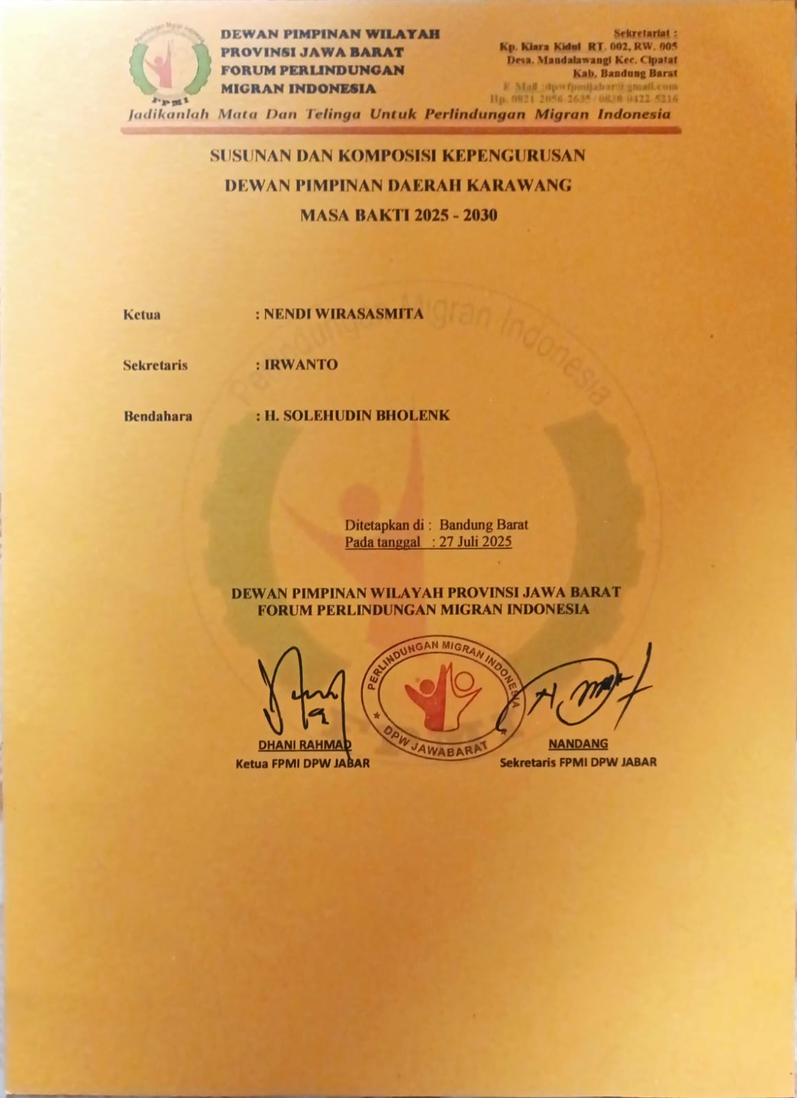 Penetapan ini tertuang dalam Surat Keputusan Ketua FPMI Dewan Pimpinan Wilayah (DPW) Jawa Barat, nomor: 03/SK/DPW-FPMI/VII/2025, tentang Pengesahan Susunan dan Komposisi Kepengurusan FPMI DPD Kabupaten Karawang. SK tersebut ditandatangani dan dikeluarkan pada tanggal 27 Juli 2025.