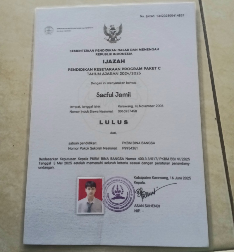 Kepala PKBM Bina Bangsa Asan Suhendi,.SE , saat dikonfirmasi, menegaskan bahwa ijazah Paket C memiliki legalitas yang sama dengan ijazah SMA/SMK. Adapun untuk siswa atas nama Saeful Jamil adalah pindahan kelas 3, sebelumnya sekolah di SMK Swasta.