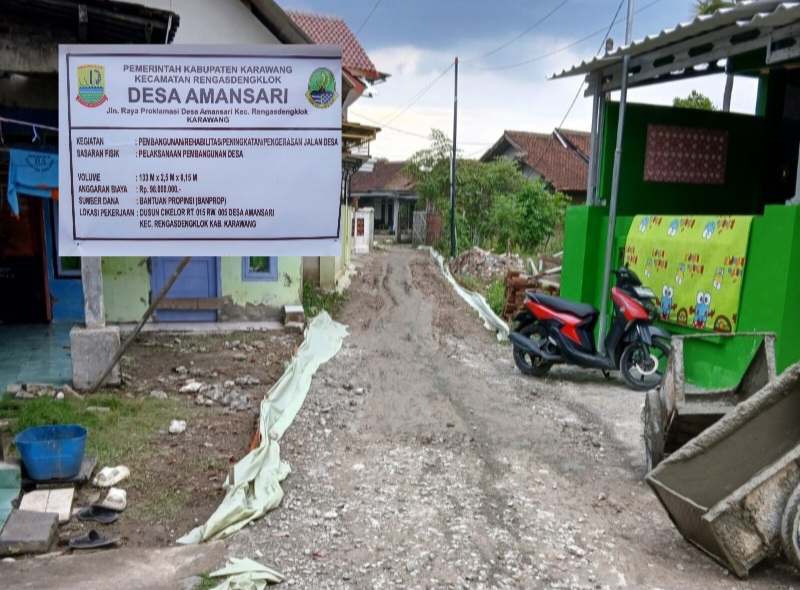 KARAWANG — Kepala Desa Amansari, Kecamatan Rengasdengklok, Kabupaten Karawang, Hanapi, berhasil merealisasikan program bantuan provinsi (Banprov) yang diarahkan untuk pembangunan rehabilitasi dan peningkatan pengerasan jalan desa di wilayah Dusun Cikelor RT 015 RW 005, Desa Amansari.
