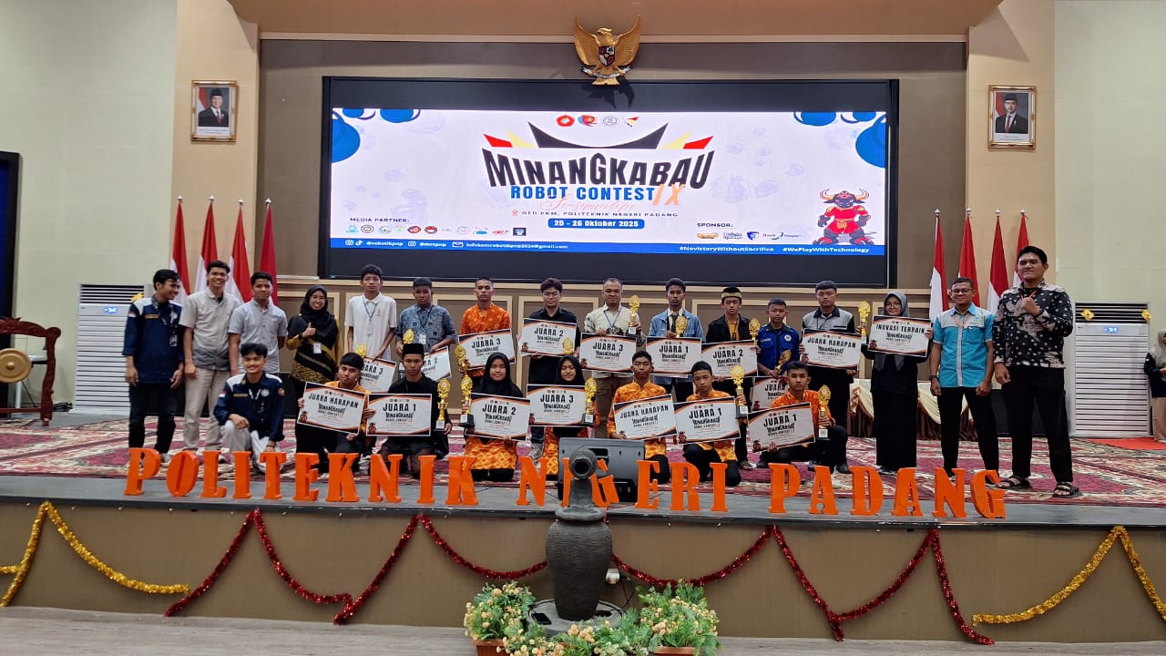 Ket Fhoto: foto bersama peserta saat pengumuman hasil olimpiade robotik MRC dengan panitia di Politeknik Negeri Padang Sumatera Barat, Minggu, 26 Oktober 2025