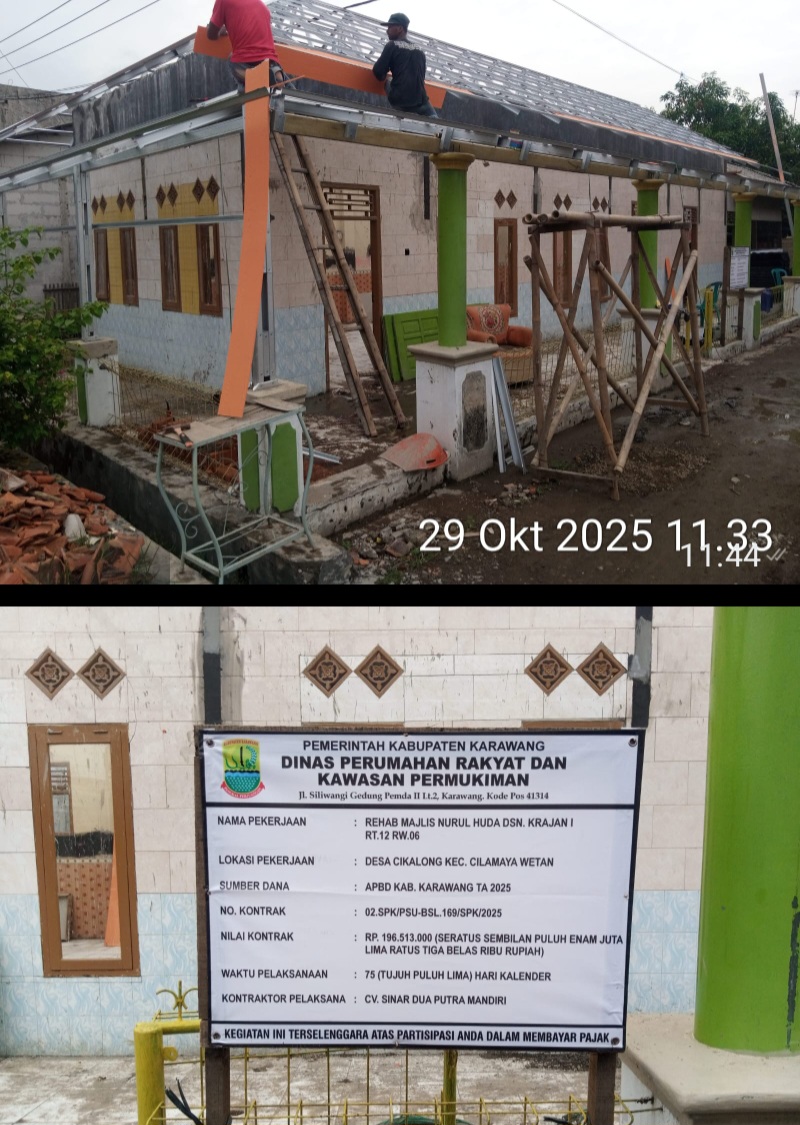 KARAWANG — Proyek rehabilitasi bangunan Majelis Nurul Huda yang berlokasi di Dusun Krajan I RT 12 RW 6, Desa Cikalong, Kecamatan Cilamaya Wetan, menuai sorotan warga. Pasalnya, pada papan informasi proyek yang terpasang di lokasi, tidak tercantum tanggal mulai dan berakhirnya pekerjaan, sehingga menimbulkan kebingungan di kalangan masyarakat sekitar.