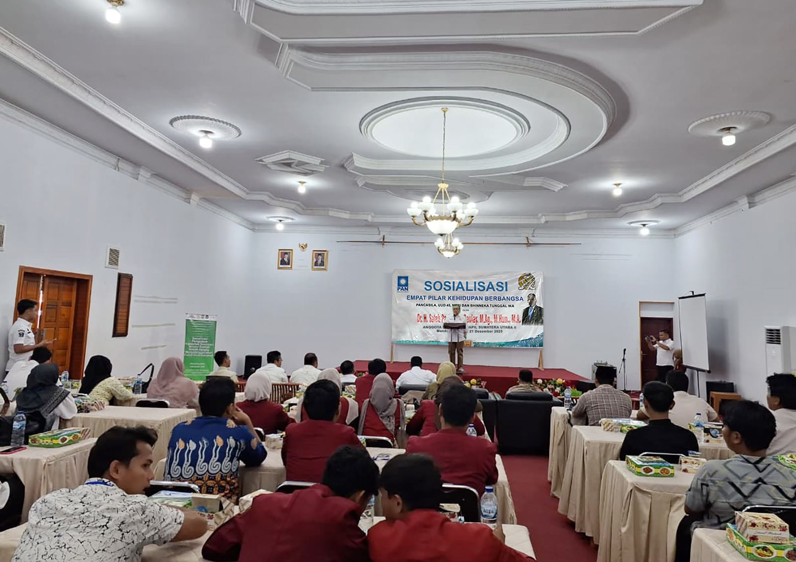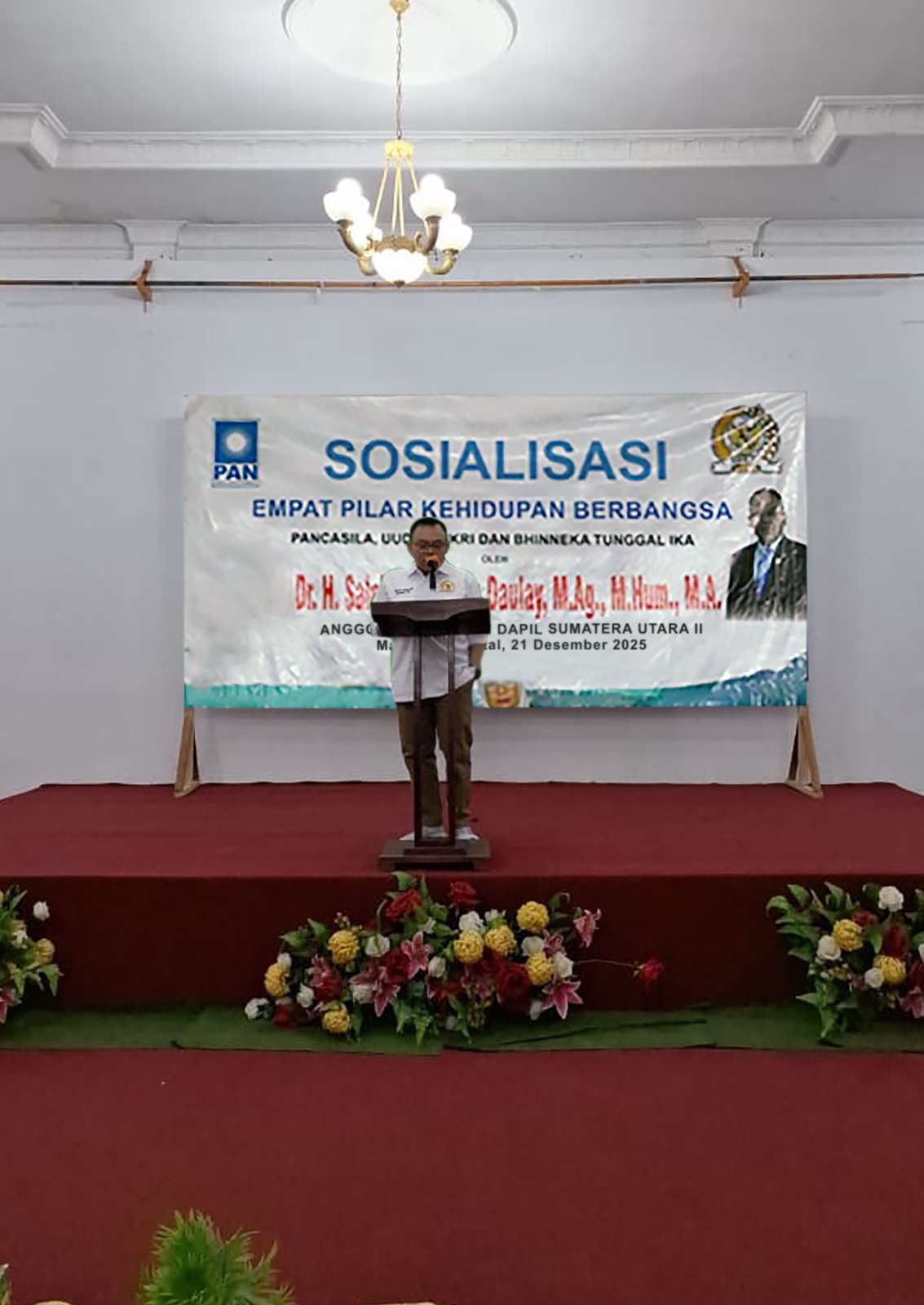 Demikian disampaikan oleh Anggota DPR/MPR RI DR. Saleh Partaonan Daulay, M.Ag.,M.Hum.,M.A di hadapan para Mahasiswa dan Ortom Muhammadiyah dalam acara Sosialisasi Empat Pilar Berbangsa dan Bernegara di Ballroom Ladang Sari Panyabungan, Minggu (21/12/2025) pukul 14.00 sampai 16.00 Wib.