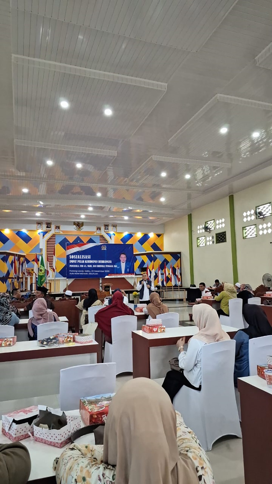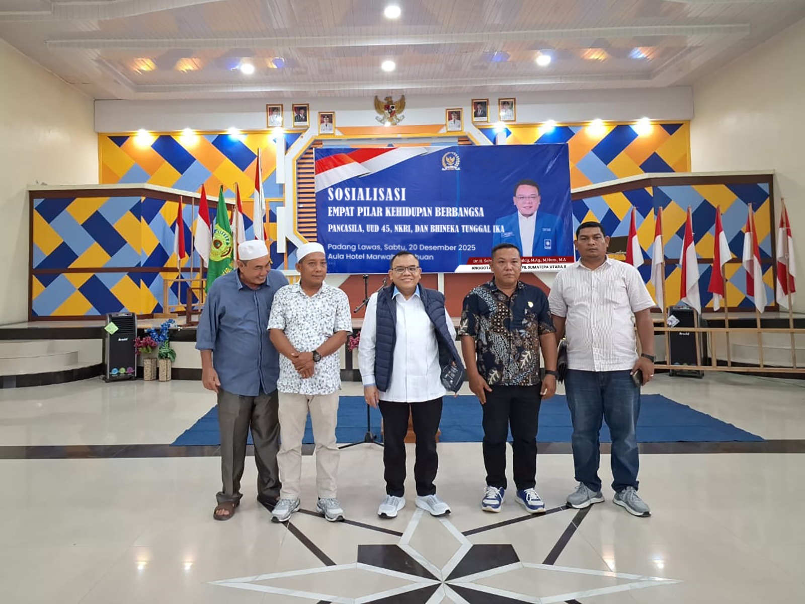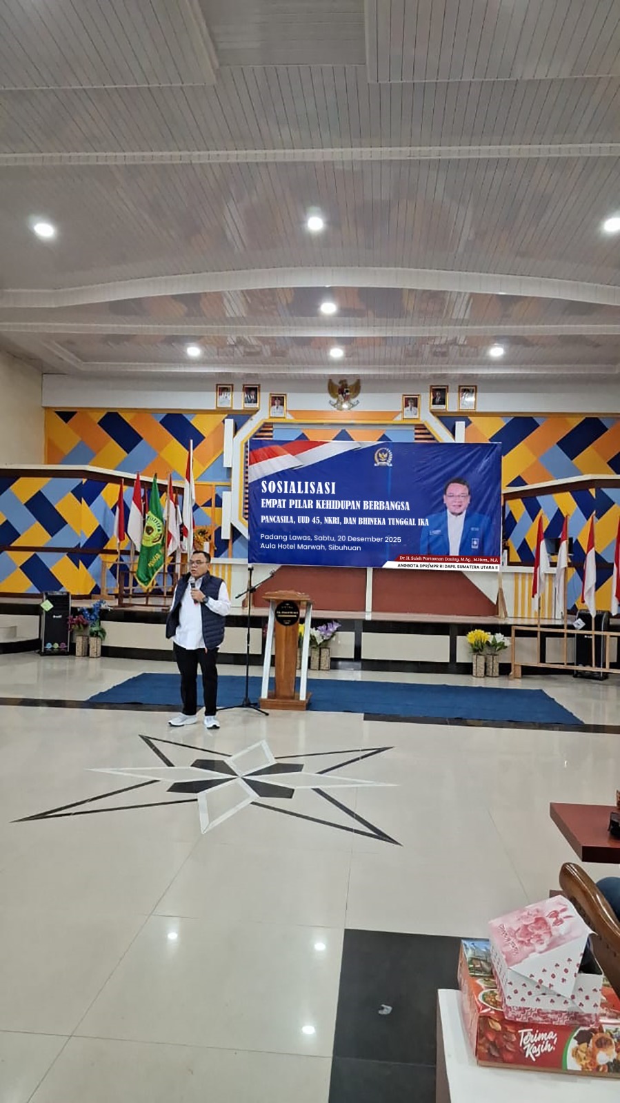 Demikian disampaikan oleh DPR/MPR RI DR. Saleh Partaonan Daulay, M.Ag.,M.Hum.,M.A salah seorang Legislatif dari partai berlambang Matahari di DPR/MPR RI dalam acara Sosialisasi Empat Pilar Berbangsa dan Bernegara di ini di Hotel Marwah, Jl. Kihajar Dewantara, Bangun Raya, Kec.Sibuhuan, Palas, Sabtu (20/12/2025), kegiatan tersebut berlangsung pukul 18.00-22.00 wib diikuti oleh Masyarakat, Pemuda dan Mahasiswa.