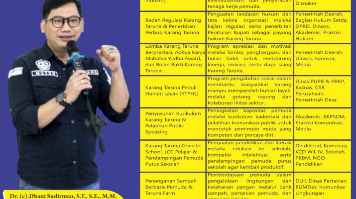 Adapun Karang Taruna Saba Desa menjadi instrumen konsolidasi organisasi hingga tingkat desa dan unit RW guna memastikan kesinambungan program serta penguatan struktur kelembagaan Karang Taruna di akar rumput. Menurut Dhani, pembangunan pemuda harus dimulai dari desa sebagai fondasi utama kemajuan bangsa. Mengutip Bung Hatta, ia menyampaikan, “Indonesia tidak akan besar karena obor di Jakarta, tetapi karena pelita di desa-desa.” Kesembilan Program Strategis Karang Taruna Kabupaten Karawang Tahun 2026 tersebut disusun selaras dengan Peraturan Menteri Sosial Nomor 25 Tahun 2019 dan Nomor 9 Tahun 2025 tentang Karang Taruna, serta sejalan dengan visi dan misi Bupati Karawang, H. Aep Syaefuloh, S.E., dalam mewujudkan Karawang yang maju, berdaya saing, dan berkeadilan.