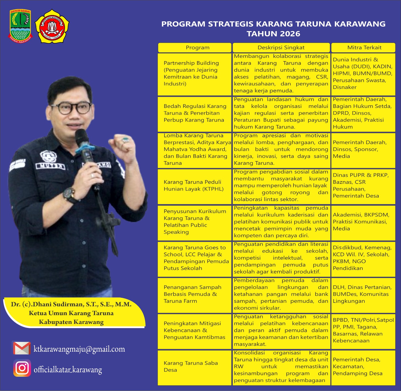 Adapun 9 Program Strategis Karang Taruna Kabupaten Karawang Tahun 2026 meliputi 1) Partnership Building sebagai upaya penguatan jejaring kemitraan ke dunia industri; 2) Bedah Regulasi Karang Taruna dan Penerbitan Peraturan Bupati Karang Taruna untuk memperkuat landasan hukum serta tata kelola organisasi; 3) Lomba Karang Taruna Berprestasi, Aditya Karya Mahatva Yodha Award, dan Bulan Bakti Karang Taruna sebagai instrumen apresiasi dan motivasi guna mendorong kinerja, inovasi, serta daya saing organisasi; 4) Karang Taruna Peduli Hunian Layak (KTPHL) sebagai wujud kepedulian sosial pemuda melalui semangat gotong royong dan kolaborasi lintas sektor; 5) Penyusunan Kurikulum Karang Taruna dan Pelatihan Public Speaking dalam rangka peningkatan kapasitas, kualitas kepemimpinan, dan kepercayaan diri pemuda; 6) Karang Taruna Goes to School, Lomba Cerdas Cermat Pelajar, dan Pendampingan Pemuda Putus Sekolah untuk memperkuat pendidikan, literasi, serta inklusi sosial pemuda sejak usia sekolah; 7) Penanganan Sampah Berbasis Pemuda dan Taruna Farm yang mengintegrasikan pengelolaan lingkungan, ekonomi sirkular, dan ketahanan pangan; 8) Peningkatan Mitigasi Kebencanaan dan Penguatan Kamtibmas guna membangun ketangguhan sosial, kesiapsiagaan bencana, serta keamanan dan ketertiban masyarakat; serta 9) Karang Taruna Saba Desa sebagai program konsolidasi organisasi dan penguatan kelembagaan Karang Taruna hingga tingkat desa dan unit RW guna menjamin kesinambungan program pembangunan pemuda.