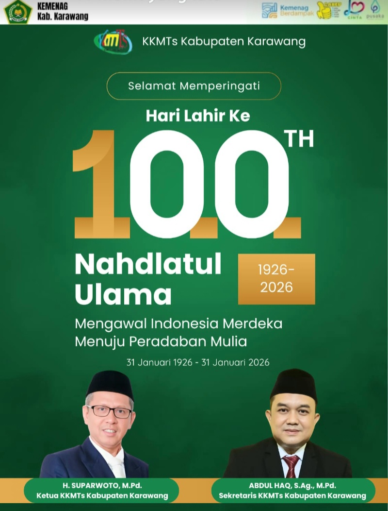 KARAWANG – Keluarga Besar KKMTS Kabupaten Karawang menyampaikan ucapan selamat dan apresiasi setinggi-tingginya atas peringatan Hari Lahir (Harlah) ke-100 Nahdlatul Ulama (NU) yang jatuh pada 31 Januari 2026.