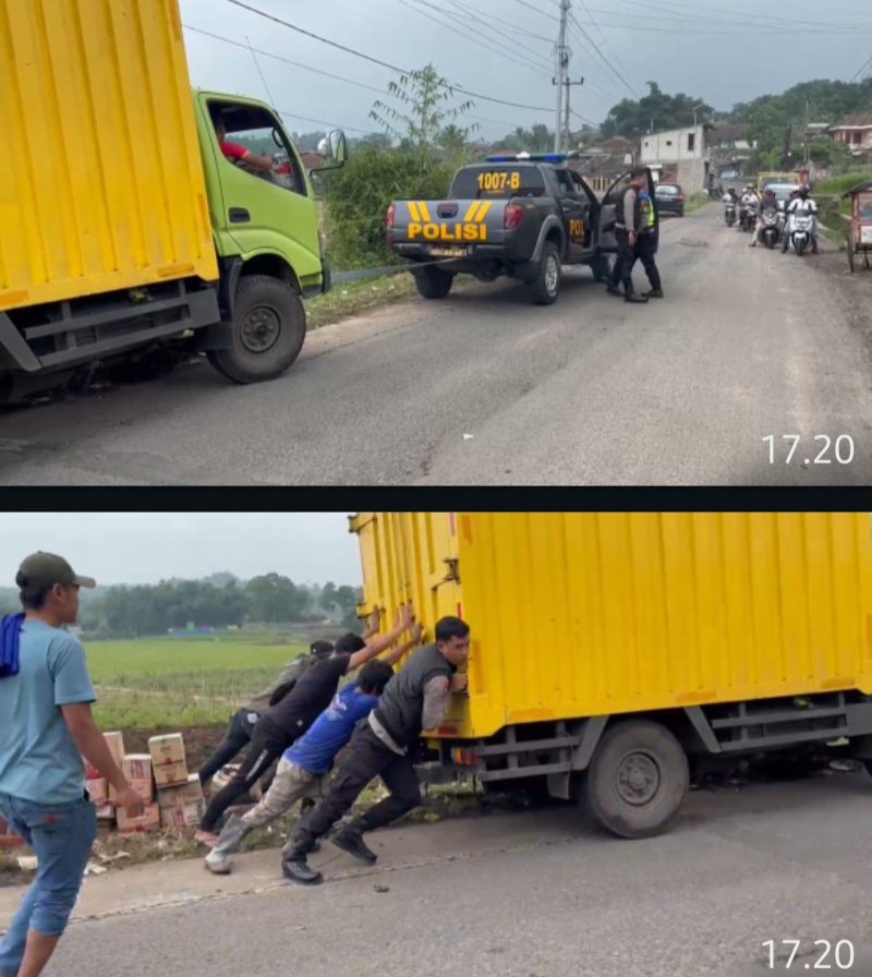 Respons Cepat Polsek Pasirwangi Polres Garut Evakuasi Mobil Box Terperosok Parit