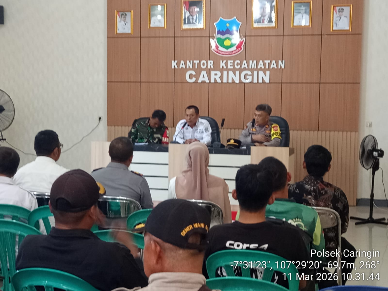 Rapat koordinasi lintas sektoral ini dipimpin langsung oleh Camat Caringin Ujang Kuswara, S.Tr., M.Si., didampingi Kapolsek Caringin Indra Koncara, serta Danramil 1123/Cisewu yang diwakili oleh Danposramil Suryana berpangkat Serka.