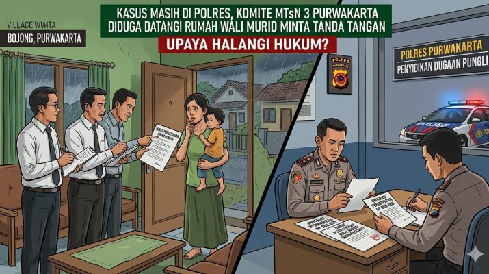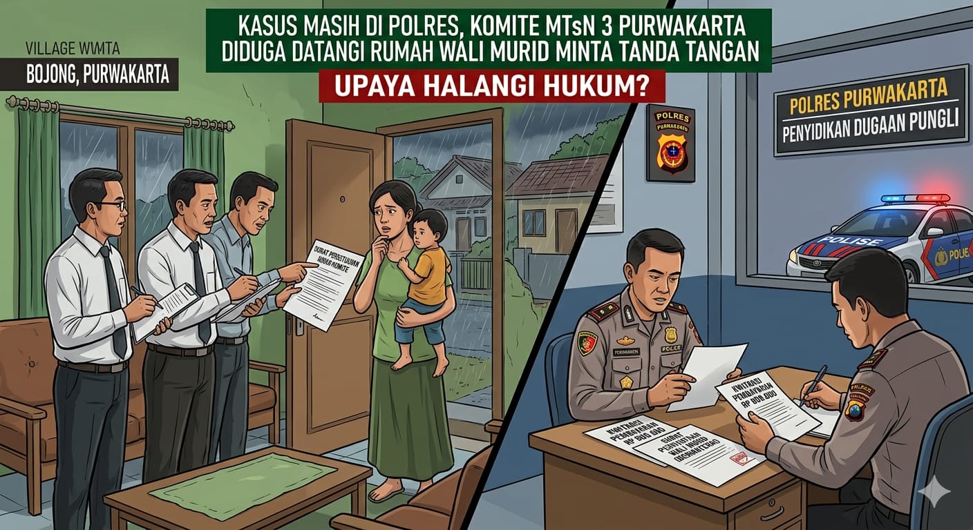 PURWAKARTA – Di tengah proses penanganan kasus dugaan pungli di MTsN 3 Purwakarta (Bojong) oleh Polres Purwakarta, muncul informasi mengejutkan. Pihak komite sekolah diduga mendatangi langsung rumah-rumah wali murid yang tidak hadir pada pertemuan komite 10 Maret 2026 lalu, untuk meminta tanda tangan terkait iuran yang kini sedang menjadi pokok perkara.