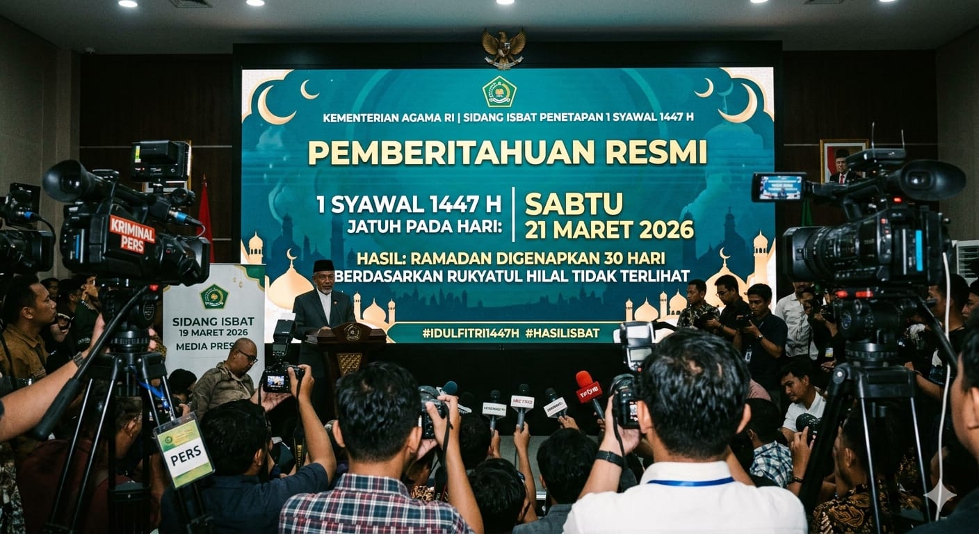 JAKARTA – Melalui mekanisme Sidang Isbat yang digelar di Kantor Kementerian Agama RI, Pemerintah secara resmi menetapkan 1 Syawal 1447 Hijriah atau Hari Raya Idulfitri jatuh pada Sabtu, 21 Maret 2026. Keputusan ini diambil setelah laporan pemantauan hilal di 117 titik di seluruh wilayah Indonesia menyatakan posisi bulan belum memenuhi kriteria MABIMS.