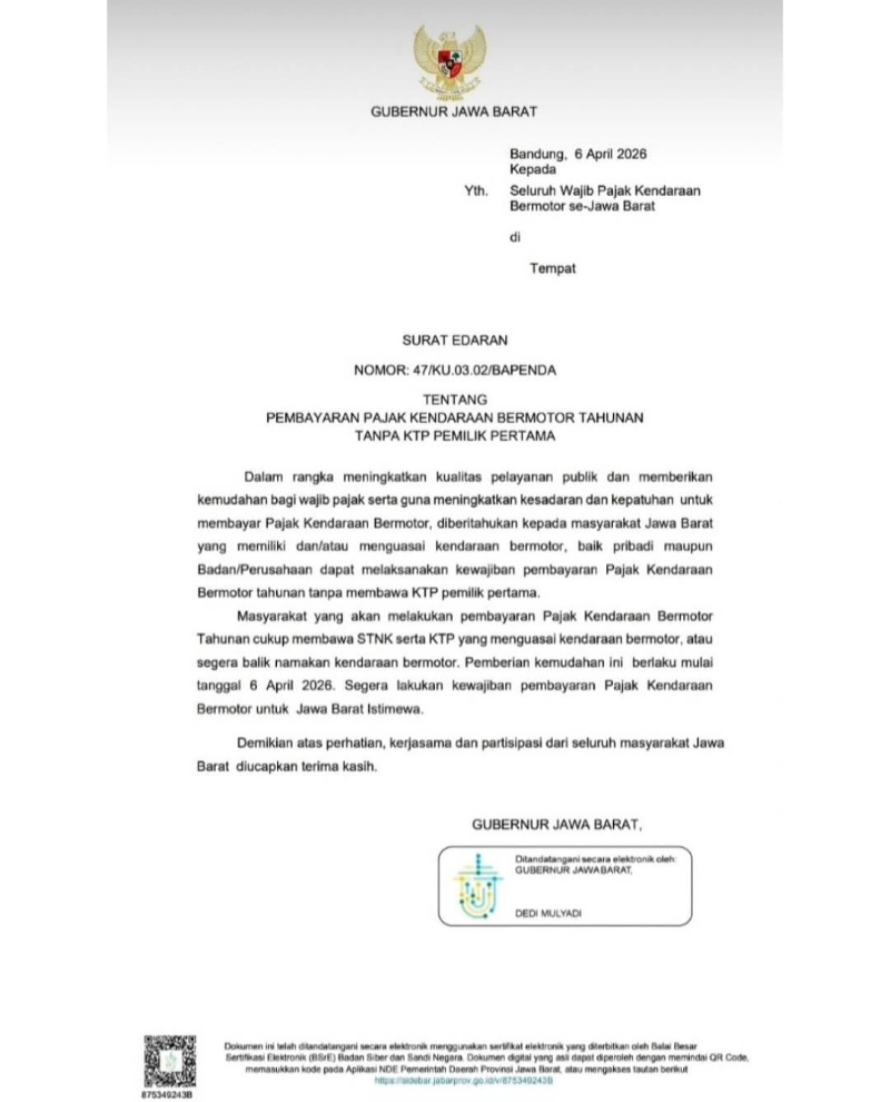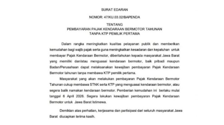 BANDUNG , 6 April 2026 – Gubernur Jawa Barat, Dedi Mulyadi, resmi menerbitkan surat edaran terbaru terkait kemudahan pembayaran Pajak Kendaraan Bermotor (PKB) tahunan bagi masyarakat di wilayah Jawa Barat.