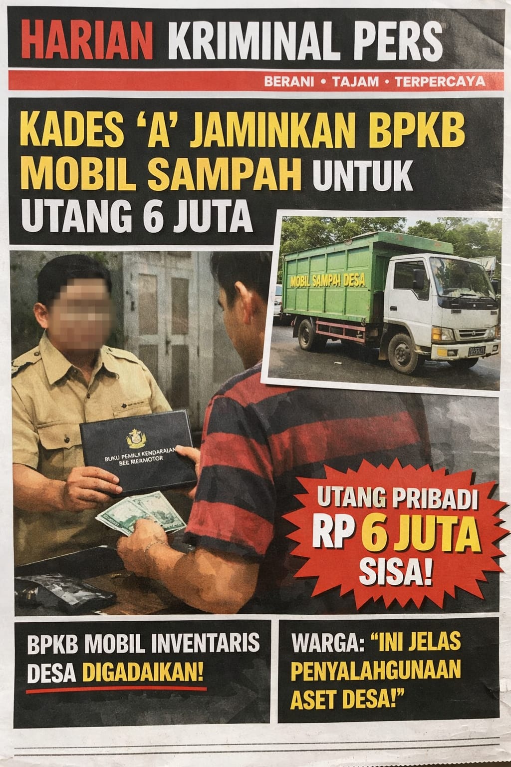 Berdasarkan keterangan narasumber, transaksi pinjaman tersebut menyisakan utang sebesar Rp6 juta. Sebagai jaminan, oknum kepala desa itu menyerahkan BPKB mobil sampah desa—yang merupakan barang inventaris resmi milik desa di wilayah Kabupaten Purwakarta.