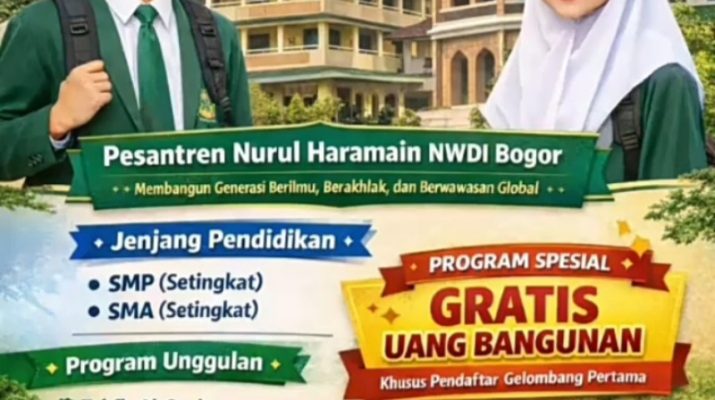 Gratis Uang Bangunan Gelombang Pertama, Pesantren Nurul Haramain NWDI Bogor Buka Pendaftaran Santri 2026–2027 BOGOR — Pondok Pesantren Nurul Haramain NWDI Bogor secara
